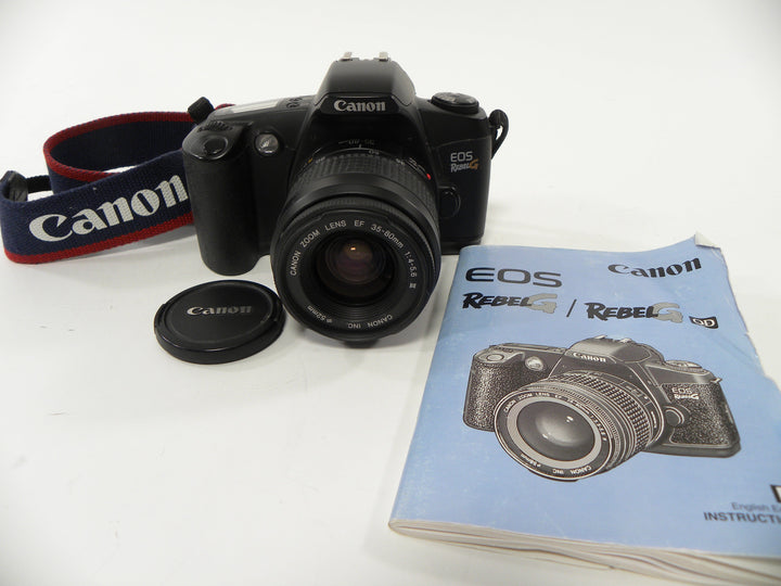 Canon EOS Rebel G 35mm SLR film camera with a EF 35-80mm f4-5.6 III lens has been tested and is in Excellent working condition, comes with a Manual, strap, and lens cap.
