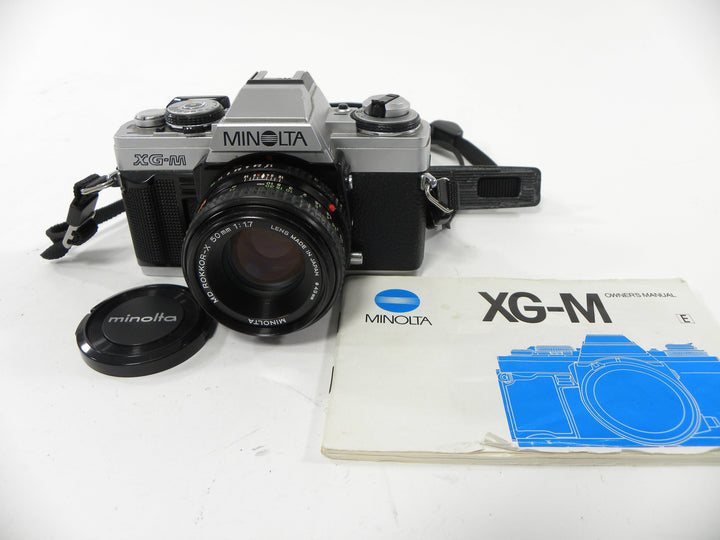 Minolta XG-M 35mm SLR film camera with a MD Rokkor-X 50mm f1.7 lens has been tested and is in Excellent working condition, comes with a Manual, strap, and lens cap.