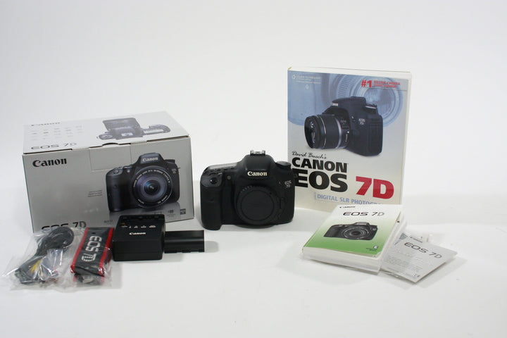 This Camera is in Excellent condition. It has been tested and all functions work as they should. Cosmetically there is typical wear from use. This camera comes with a body cap, a strap, instruction manuals, AV cables, computer software, and a Copy of David Busch's Canon EOS 7D Guide to Digital SLR Photography!