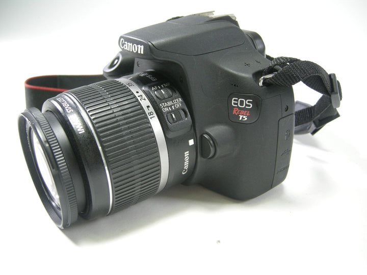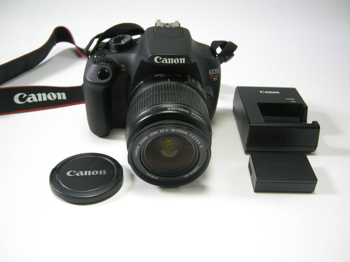 Canon EOS Rebel T5 18.0mp Digital SLR with a EF-S 18-55mm f3.5-506 IS lens and a shutter ct. of 1,985 has been tested and is in Excellent working condition, comes with a battery, charger, lens cap, and strap.